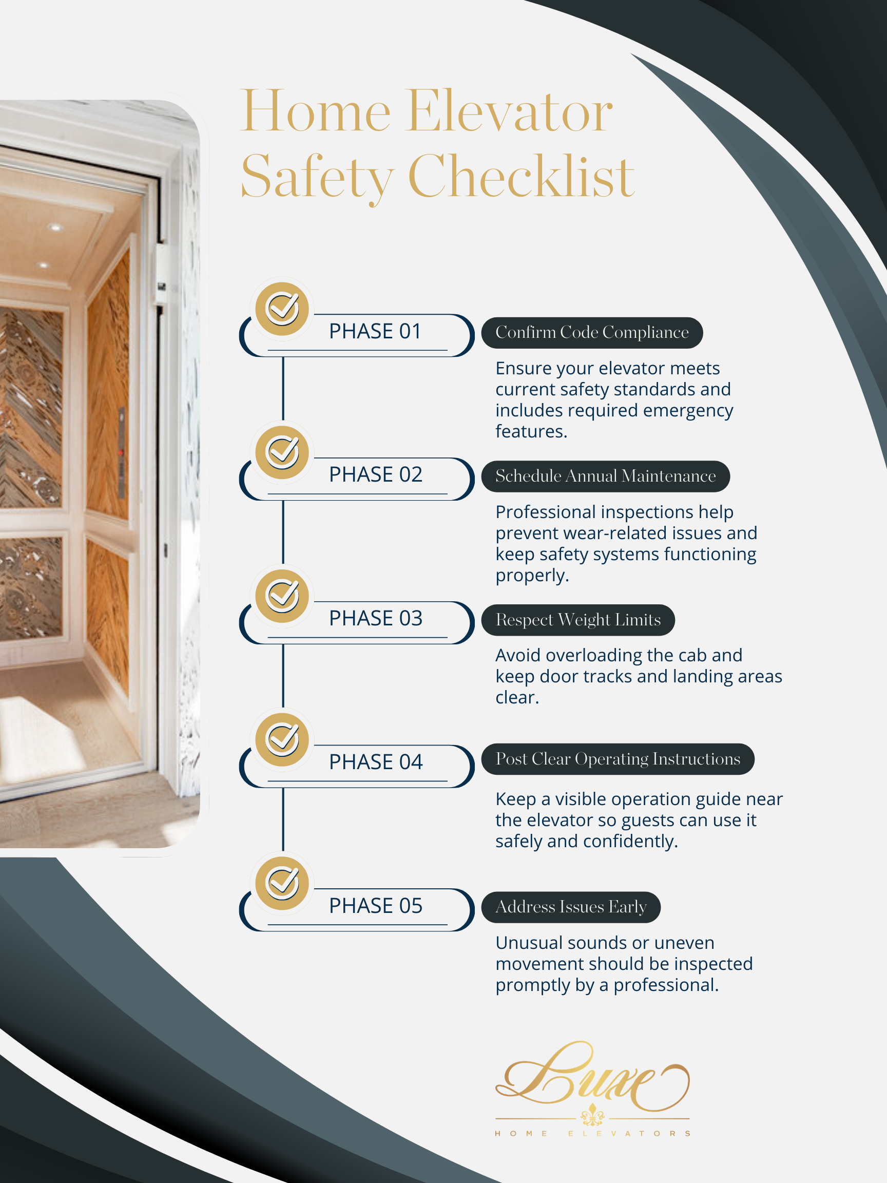 Home elevator safety isn’t complicated — but it is intentional. With proper installation, routine maintenance, visible guidance for guests, and simple user awareness, your elevator can remain one of the safest and most reliable features in your home. Need a safety inspection or maintenance review? Luxe Home Elevators is here to help.