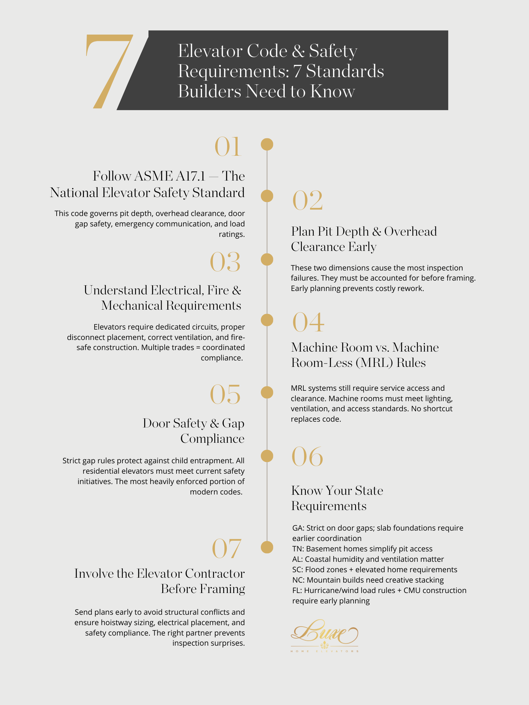 At Luxe Home Elevators, we partner with builders and designers across the Southeast to review plans, advise on code requirements, and ensure your elevator is compliant long before the inspector walks through.